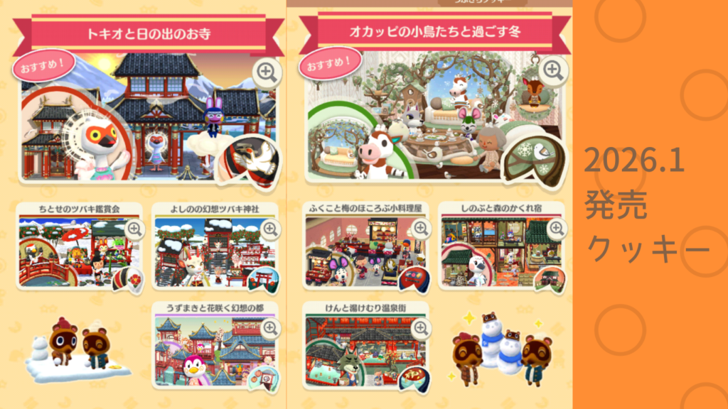 全体的に雪と和風なクッキーが多いですね。⑩~⑫はアジアな雰囲気漂うカフェ系クッキー。キャンプ場を日本のお正月や雪を楽しめるレイアウトにして、コテージはほっこりカフェにしても楽しそうですね。