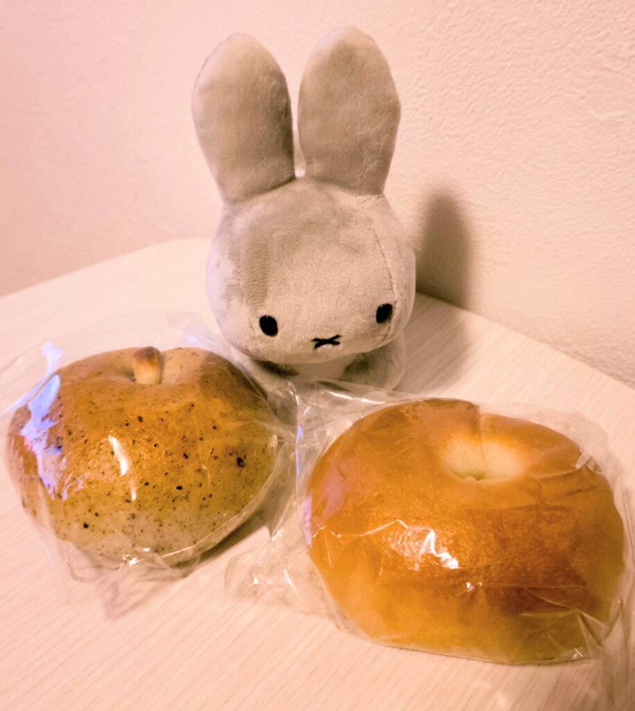 種類が多くて悩みながらも、運よく値引きされていたベーグルがいくつかありましたので、その中から「まるでアップルパイ」(と「ほうじ茶大納言」(写真左)を購入。