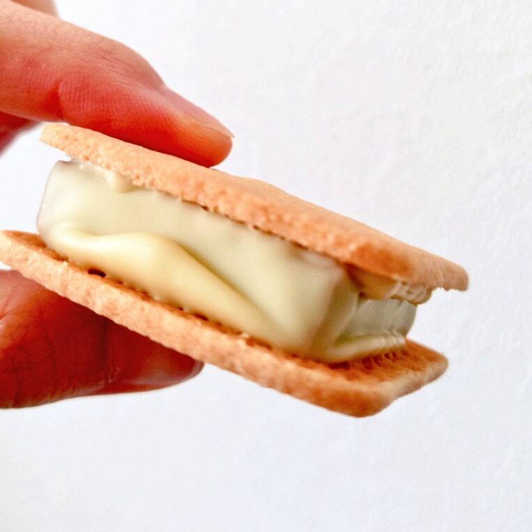 ショーコラと相性ばっちりになるよう工夫された「キャラメルソースとクルミが入ったガナッシュ」を、ホワイトチョコレートで包み込みました。さらに、バター生地のクッキーではさむことで、贅沢で優しい味わいに仕上がりに。