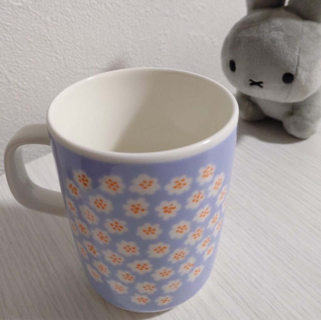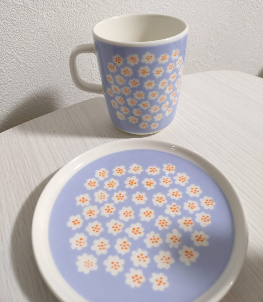 こんにちは。今日は先日のブログですでに登場しているのですが、我が家に来てくれたマリメッコプケッティ柄ライトブルー×オレンジのマグカップとプレートをご紹介させてください。