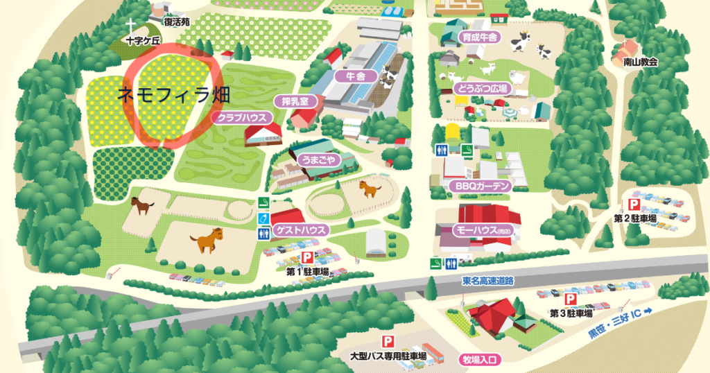 2026年の愛知牧場では、4/9よりネモフィラ畑がオープンしています。
