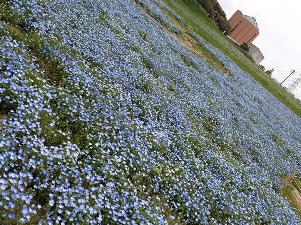 ネモフィラ畑4月中旬現在下半分はほぼピーク「GW前に見頃」