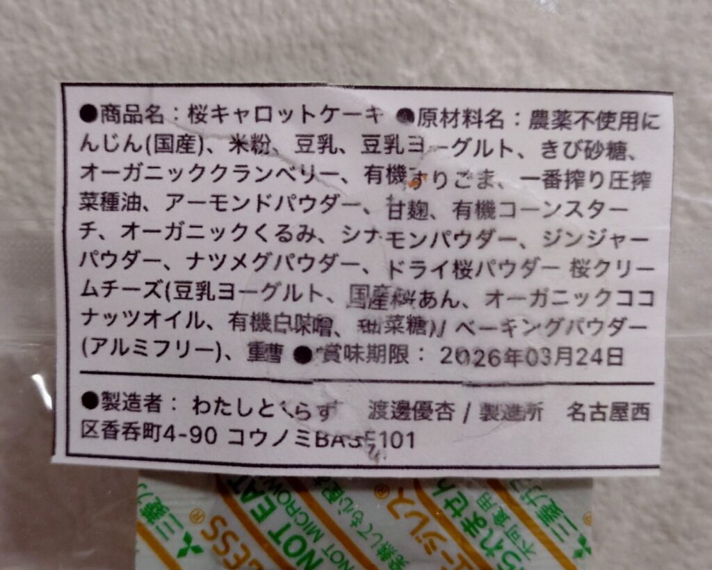 【わたしとくらす】の「桜キャロットケーキ」購入価格:860円。原材料は画像をご参照ください。