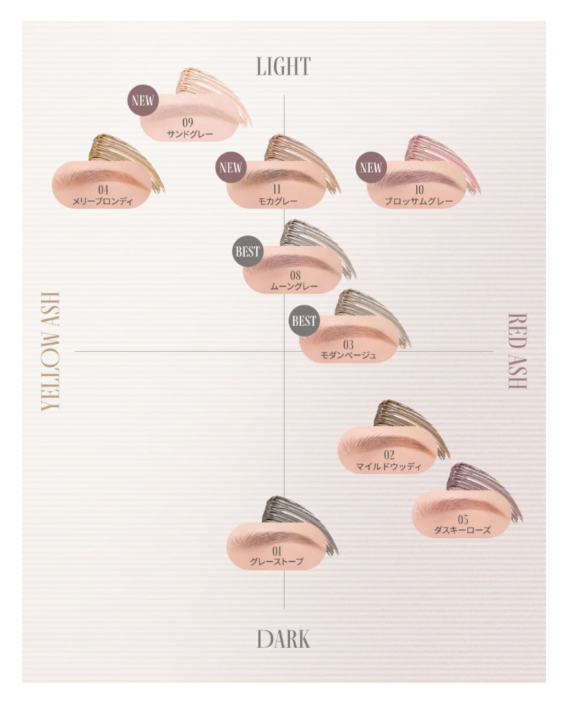 黒髪さんならまずチェックしてほしい2色。眉毛をナチュラルにカバーしたいなら08ムーングレーが、眉毛の黒さをしっかりカバーしたいなら11モカグレーを選ぶとよいと思います。